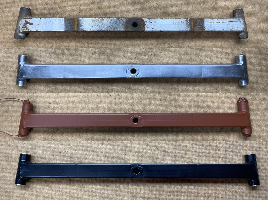 Avant de démarrer la rénovation du châssis, un petit test est réalisé sur une pièce de la direction de la Mercedes mini. Le métal de la pièce est tout d’abord poncé et complètement mis à nu, puis une couche d’anti-rouille est appliquée, enfin la couche finale en noir foncé satiné (RAL 9005).